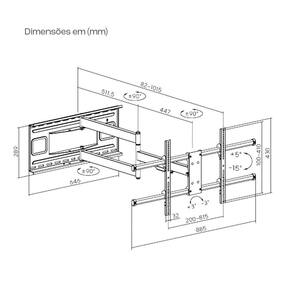 Suporte articulado indicado para tvs 3d, lcd, led com peso até 50 kg e compatíveis com padrão de fixação vesa 200x100, 200x200, 200x300, 300x200, 300x300, 400x200, 400x300, 400x400, 600x200, 600x400, 800x200, 800x400 mm hxv , normalmente encontrado em televisores de 43 a 80 polegadas.