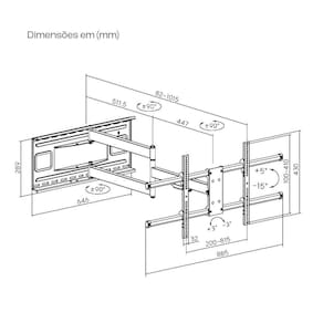 Suporte articulado indicado para tvs 3d, lcd, led com peso até 50 kg e compatíveis com padrão de fixação vesa 200x100, 200x200, 200x300, 300x200, 300x300, 400x200, 400x300, 400x400, 600x200, 600x400, 800x200, 800x400 mm hxv , normalmente encontrado em televisores de 43 a 80 polegadas.