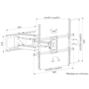 :: Material: Aço Carbono; :: Carga máxima: 75kg; :: Compatibilidade VESA: 200x200 a 800x600 mm HxV ; :: Distância mínima da parede: 6,9 cm; :: Distância máxima da parede: 63,5 cm.