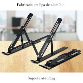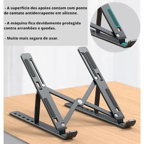 Suporte base de apoio para Notebook, Laptop, Tablet, etc. Portátil e ajustável 6 níveis. O suporte é produzido em liga de alumínio, é Firme e não fica balançando, possui regulagem de altura em 6 posições permitindo Que a tela fique na posição ideal de acordo com sua necessidade. Atende a norma regulamentadora NR 17. É dobrável, ajustável e de fácil transporte. Melhora a ventilação, mantém seu Aparelho na temperatura ideal sem a necessidade de cooler pois evita o super Aquecimento. É armazenado na capa de proteção que Acompanha o produto e possui apoio duplo frontal para evitar quedas. Mantém acesso a todas portas Frontais, laterais e traseira. Principais características: - Prático e portátil - Permite vários ângulos de trabalho até 6 Níveis de ajuste - Apoio duplo frontal para evitar deslizamento Do notebook - Não ocupa porta USB e outras - Mantém a temperatura de trabalho evitando Super aquecimento Material: Liga de alumínio, silicone e metal. Dados Técnicos: - Dimensões Aberto: AxLxP 15 x 18 x 25 cm - Dimensões Fechado: AxLxP 1,5x 4,5 x 25 cm - Aprox. 260 gramas Conteúdo da embalagem: 1 suporte para laptop 1 Capa de armazenamento de tecido TNT. Imagens meramente Ilustrativas ==================================== de 90 dias para defeitos de fabricação ==================================== Marca: Não Informado