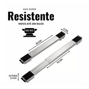 Por que escolher nossos suportes Fácil de usar e ajustável: adapta-se perfeitamente a eletrodomésticos/móveis de 40 cm a 70 cm de profundidade. Travas de segurança: mantenha os equipamentos no lugar, liberando as rodinhas apenas quando quiser mover. Construção robusta de aço: aço resistente que suporta até 200kg. Base antiderrapante e anti vibração: protege seus pisos e móveis enquanto os move. Instalação rápida e simples: não requer ferramentas.