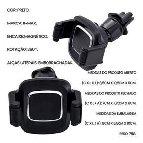 Suporte BMG-27 Veicular para Celular Esse modelo se fixa na saída de ar condicionado, apenas encaixado, seu telefone celular fica satisfatoriamente preso, sem correr risco nenhum de cair. Possui giratória de 360 graus, permite que você tenha múltiplos ângulos de visão. Características do Produto: Modelo:bmg-27. Cor: Preto. Marca: B-max. Encaixe: Magnético. Rotação: 360 . Alças Laterais: Emborrachadas. Medidas do produto Aberto C x L x A : 8,5cm x 10,5cm x 6cm. Medidas do produto Fechado C x L x A : 7cm x 10,5cm x 6cm. Medidas da Embalagem C x L x A : 8cm x 6,5cm x 10cm. Peso: 79g. Conteúdo Embalagem: 01 Suporte BMG-27 Veicular para Celular Marca: Não Informado Ean: 7896258496589
