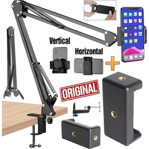 Suporte braço articulado de mesa celular smartphone garra apoio horizontal vertical foto vídeo selfie podcast escritório