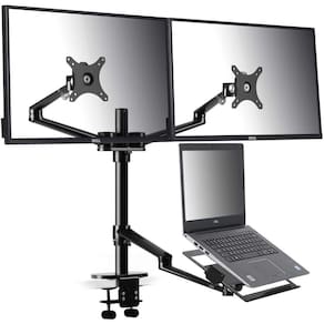 Suporte para colocação de 2 monitores e/ou notebook em mesa - 3 em 1 Pode se movimentado para ajustar a altura, o comprimento e o ângulo. Não importa como você se senta ou fica de pé, ele sempre pode se ajustar a posição mais adequada para você. Projetado para escrivaninha, mesa, mesa de centro cuja espessura da borda está entre 1,5 cm - 7 cm de espessura.VESA rápido A placa VESA de liberação rápida torna a instalação e remoção do monitor rápida e fácil.Gerenciamento de cabos O sistema de cabos ocultos coleta os fios na tampa deslizante do braço, mantém a mesa os cabos limpos e organizadosEspecificações:2 x braços para monitor de computador- Se encaixa no tamanho da tela: 15 a 32 - Ajuste de altura: 19,05 cm - 42 cm- Suporte: gira 360 , inclina-se -55 + 90 - Capacidade de peso: 9 kg - Comprimento do braço: Primeiro braço: 22,50 cm, segundo braço: 25 cm- VESA: 75x75mm, 100x100mm Ajuste a distância máxima horizontalmente: 52,07 cm1 x bandeja do laptop- Adapta-se ao tamanho do laptop: 10 a 17 - Ajuste de altura: 0 - 42 cm - Suporte: gira 360 , inclina 45 Nota: se você quiser deixar o laptop ficar baixo, tudo o que você precisa fazer é montar reversamente o conector do braço e ter cuidado com a sua mesa.Clamp C- A faixa de espessura da mesa usando o método de montagem da braçadeira C padrão é de 1,52 cm - 7 cm