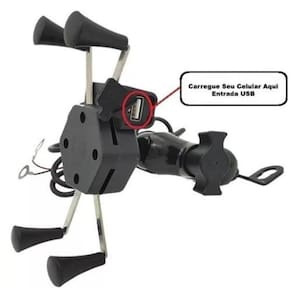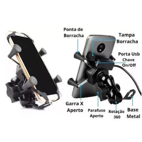 Suporte para celular moto com carregador usb resistente e seguro Suporte de ferro alta resistencia com carregador usb com tampa de borracha Medidas: para celulares e gps com 3.5 á 6 polegadas. Voltagem padrão de entrada: 12v - 30v. Corrente de saída: 2a. Voltagem de saída: 5v. Produto elaborado com material de alta qualidade, testado e aprovado dentro das normas de segurança. - acompanha na embalagem: 1 -suporte celular. 1 -borracha de fixação. 2 -selos de fixação.