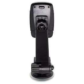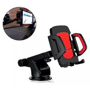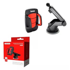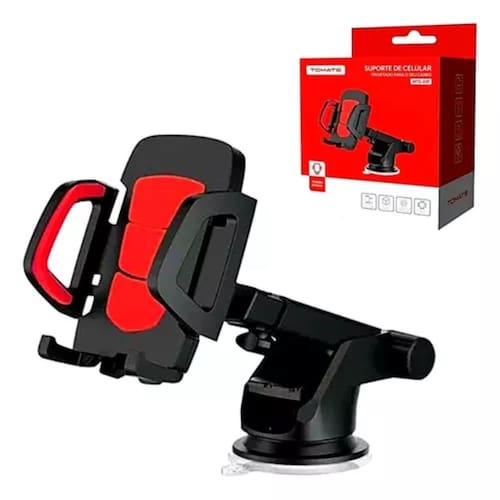 Suporte para celular com fixação por ventosa, sendo possível ser utilizado no para-brisa e no painel do carro.