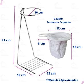 Com medidas de 10 cm de diâmetro, 31 cm de altura e 15 cm de largura, o suporte é compacto e se encaixa perfeitamente em qualquer ambiente. Já o coador possui 12 cm de diâmetro e 18 cm de comprimento, o que o torna ideal para preparar uma xícara de café na medida certa.
