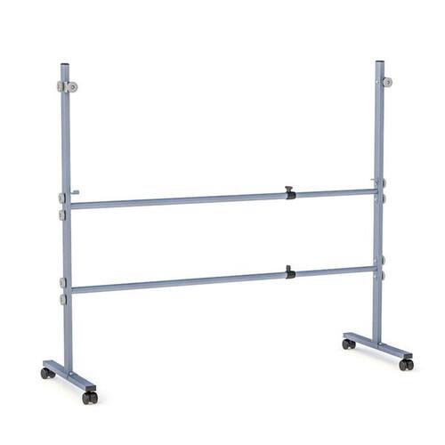 Suporte universal para quadro, possui regulagem de largura (suporta quadros de 120 a 200 cm de largura) e rodízios com trava.