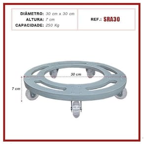 Suporte De Alumínio Redondo Com Rodízios Gel Para Vaso 30 CmSuporte de alumínio Redondo com rodinhas de silicone gel anti-risco e anti ruido.Ideal para facilitar a locomoção de objetos em geral, como vasos de plantas, eletrônicos, eletrodomésticos, entre outros.Em qualquer ambiente, sem ruídos e sem riscar ou danificar o seu piso5 rodízios giratórios - suportam até 250 kgModelo SRA30Medidas técnicas do suporte: Altura total: 7 cm; Largura da base: 30x30 cm;Medidas técnicas do rodízio:Contém 5 rodasDiâmetro da roda: 35 mm;Vantagens:· grande durabilidade e resistência;· não enferrujam;· não riscam;· antirruídos;· suportam grande quantidade de peso