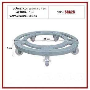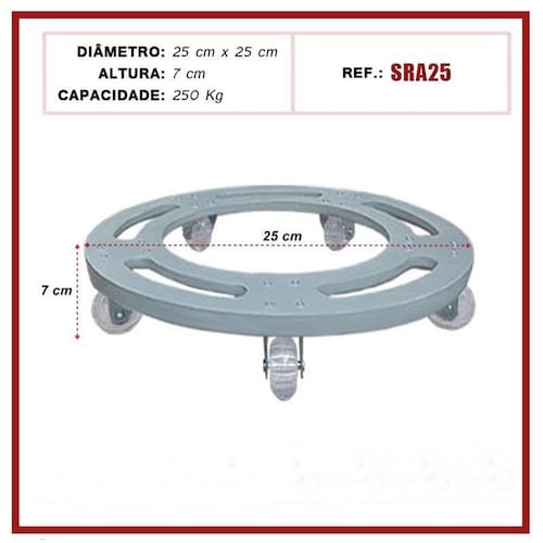 Suporte De Alumínio Redondo Com Rodízios Gel Para Vasos 25Cm Suporte de alumínio Redondo com rodinhas de silicone gel anti-risco e anti ruido. Ideal para facilitar a locomoção de objetos em geral, como vasos de plantas, eletrônicos, eletrodomésticos, entre outros. Em qualquer ambiente, sem ruídos e sem riscar ou danificar o seu piso 5 rodízios giratórios - suportam até 250 kg Modelo SRA25 Medidas técnicas do suporte: Altura total: 7 cm; Largura da base: 25x25 cm; Medidas técnicas do rodízio: Contém 5 rodas Diâmetro da roda: 50 mm; Vantagens: · grande durabilidade e resistência; · não enferrujam; · não riscam; · antirruídos; · suportam grande quantidade de peso