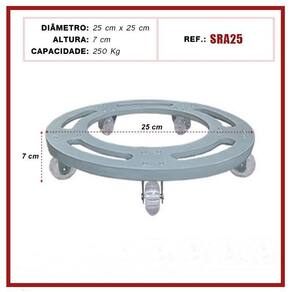 Suporte De Alumínio Redondo Com Rodízios Gel Para Vasos 25Cm Suporte de alumínio Redondo com rodinhas de silicone gel anti-risco e anti ruido. Ideal para facilitar a locomoção de objetos em geral, como vasos de plantas, eletrônicos, eletrodomésticos, entre outros. Em qualquer ambiente, sem ruídos e sem riscar ou danificar o seu piso 5 rodízios giratórios - suportam até 250 kg Modelo SRA25 Medidas técnicas do suporte: Altura total: 7 cm; Largura da base: 25x25 cm; Medidas técnicas do rodízio: Contém 5 rodas Diâmetro da roda: 50 mm; Vantagens: · grande durabilidade e resistência; · não enferrujam; · não riscam; · antirruídos; · suportam grande quantidade de peso Ean: 7898679670777