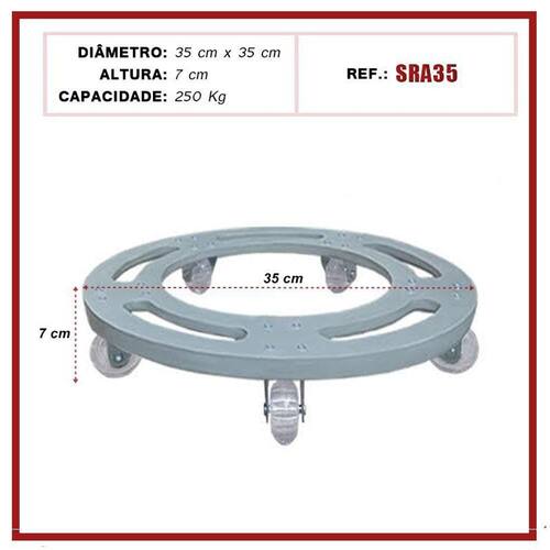 Suporte De Alumínio Redondo Com Rodízios Gel Para Vasos 35Cm Suporte de alumínio Redondo com rodinhas de silicone gel anti-risco e anti ruido. Ideal para facilitar a locomoção de objetos em geral, como vasos de plantas, eletrônicos, eletrodomésticos, entre outros. Em qualquer ambiente, sem ruídos e sem riscar ou danificar o seu piso 5 rodízios giratórios - suportam até 250 kg Modelo SRA35 Medidas técnicas do suporte: Altura total: 7 cm; Largura da base: 35x35 cm; Medidas técnicas do rodízio: Contém 5 rodas Diâmetro da roda: 50 mm; Vantagens: · grande durabilidade e resistência; · não enferrujam; · não riscam; · antirruídos; · suportam grande quantidade de peso