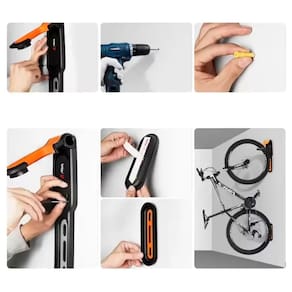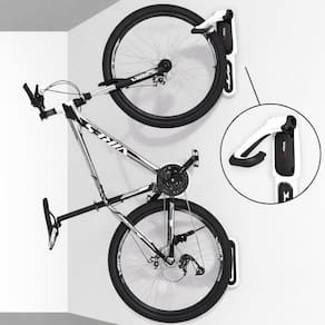 Indicado para bicicletas de até 16 kg, possibilita deixá-las totalmente suspensas na parede. Para modelos acima de 16 kg, recomenda-se manter a roda traseira apoiada no chão e fixar a roda ao suporte com fita dupla face.