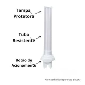 Informações adicionais: O produto satisfaz as exigências da Resolução Padrão ABNT em seu Processo de Fabricação Autorizado e Inspecionado pela ANVISA. Abrir a tampa na parte superior do tubo, intruza os copos de forma que fiquem com o fundo apontado para baixo, após o procedimento, recoloque a tampa.Pressione o botão para que o copo saia e o retire.