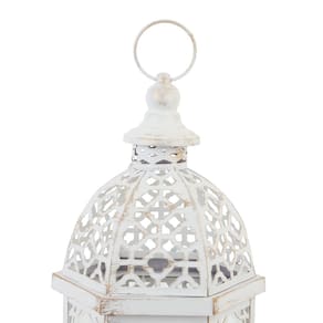 - A lanterna pesa 1 kg. e mede 17 x 15 x 40 cm com moldura de ferro e acabamento branco envelhecido estilo vintage com painéis de vidro transparente que permitem que a luz da sua vela favorita brilhe