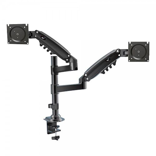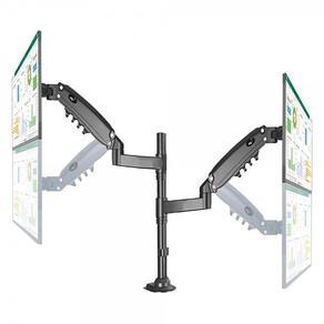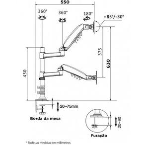 O produto permite a fixação de 2 monitores ou TVs LCD/LED de 17 a 27 polegadas, conforme os padrões de furo VESA 75x75mm e VESA 100x100mm, de 2kg a 9kg. É fabricado em alumínio injetado e polímero de alta resistência e possui capas plásticas para passagem e organização dos cabos. Acompanha kit do produto estrutura para fixação do suporte na mesa.