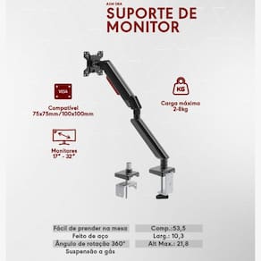 Atributos e Benefícios - Compatível com monitores de 17” a 32”: Suporta uma ampla faixa de tamanhos. - Capacidade de até 8 kg: Suporta monitores robustos com segurança e estabilidade. - Padrão VESA (75x75mm e 100x100mm): Compatível com a maioria dos modelos do mercado. - Totalmente articulado: Braços com rotação de 360°, inclinação de -90° a +45° e ajuste de altura, oferecendo ergonomia e conforto visual. - Instalação por fixação de mesa: Fácil de instalar, ocupa pouco espaço e mantém a área de trabalho organizada. - Material resistente: Fabricado em polietileno de alta durabilidade, com acabamento na cor preta elegante e discreta. - Organização e produtividade: Permite posicionar o monitor conforme a necessidade do usuário, melhorando a postura e o foco no trabalho. - Design moderno e funcional: Ideal para escritórios, home offices e ambientes gamer.