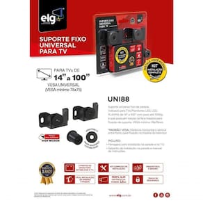 Indicado para TVs planas e curvas com peso máximo de 100 Kg e compatíveis com padrão de fixação VESA mínimo 75x75mm (horizontal x vertical), normalmente encontrado em televisores de 14'' a 100'' polegadas. Apresenta perfil slim e design compacto para deixar sua como um quadro decorando o ambiente. Distância da parede de 2,5 cm. Durabilidade, segurança e excelente acabamento o suporte UNI88 possui estrutura de fixação na parede em aço carbono com tratamento anticorrosão e pintura epóxi eletrostática de alta resistência e apoio em nylon reforçado. Em complemento à segurança, as bases de fixação na parede apresentam encaixe com deslocamento lateral, dessa forma reduz a possibilidade de que o televisor possa ser desencaixado involuntariamente. Para uma instalação ainda mais prática e fácil, o suporte conta com gabarito para furação na parede e fixação do mesmo. Acompanha ferragens para instalação na parede e no televisor.Características Técnicas Carga Max(KG): 100 kg Cor: PRETO Distância : 2,5 cm Fabricação: Aço carbono e Nylon Padrão VESA: Mínimo 75x75mm Pintura: epóxi eletrostática de alta resistência Polegadas: 14'' a 100'' Tipo: FIXO Tipo : LED / LCD / PLASMA / 3D PLANA / 3D CURVA Tratamento Superficial: Anti-Corrosão. Gabarito para instalação Trava de segurança Encaixe rápido Lugares de montagem: Parede Cor: PRETO