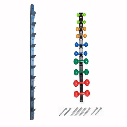 Suporte de parede com capacidade para 10 halteres 5 pares com gancho revestido e de fácil limpeza.