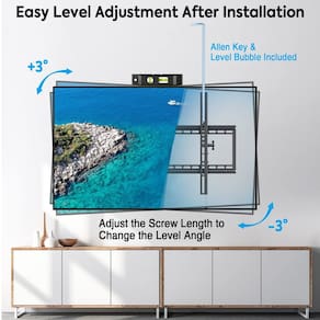 - Ajuste de nivelamento: Este suporte de TV de parede pode ser nivelado +/-3° facilmente após a instalação para a posição perfeita que você deseja. A chave Allen de 65 cm de comprimento incluída pode ajudá-lo a processar ajustes de nivelamento sem tirar a TV