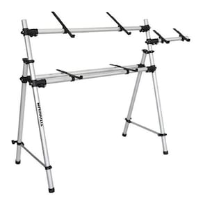 Possui barra superior para teclado / piano de até 6 oitavas, e barra dupla para teclado / piano + Suporte Lateral para acomodar Interface de audio, Notebook ou Mesa de som. - Largura de 1,50 metros; - Altura total: 1,20 metros - Profundidade total: 50 cm; - Tubo alumínio anodizado; - Cor: Alumínio fosco.