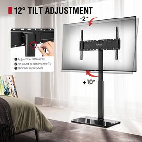 - Ajuste de inclinação giratório atualizado: este suporte giratório de TV permite que você gire sua tela 25° para a esquerda ou direita para apontar para qualquer lugar da sala. A função de inclinação de -2°-10° permite nivelar sua TV, e vale a pena mencionar que atualizamos o ajuste de inclinação para que você possa ajustar facilmente o ângulo simplesmente girando os parafusos longos na parte traseira do suporte de TV alto