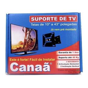 Suporte De Tv Articulado Até 40Kg Monitor/Plasma/Lcd/Led Suporte Articulado Qs-40 Canaã- Acompanha parafusos e buchas para instalação. Tipos de telas suportadas: led/lcd/plasma Tamanho mínimo da tela - Tamanho máximo da tela: 10 - 43 Lugar de montagem: Parede É inclinável: Sim É articulado: Sim É fixo: Sim Descrição SUPORTE DE TV ARTICULADO Características do Produto: Suporte para TV e Monitores LCD Plasma e LED. Capacidade: 10 A 43 Polegadas. O suporte efetua 2 movimentos. Sendo: 1 Articulação Horizontal 2 Inclinação Vertical. - material metal super resistente com parafusos e buchas Medidas aproximadas do produto - Comprimento: 18 cm - Altura: 8 cm - Largura: 15 cm - Peso: 500 g