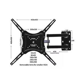 Descrição:Suporte de TV com braço de aço de 180° 14 e 55 polegadas, 50 kg, TV LED de 14 a 55 polegadas ou base de parede LCD. -Braço de extensão com rotação horizontal de 180° C, material sólido e forte. Inclui os parafusos necessários para a instalação. -Resiste a um peso máximo de 50 kg. Inclui 4 peças para ampliar a área de ancoragem da TV. -Suporte fixo que se ajusta de forma rápida e fácil com giro de ± 120°, proporcionando melhor visibilidade e conforto. -Possui um grande ângulo de mobilidade graças ao braço articulado e, assim, torna a visão da TV mais confortável e clara. Ficha técnica: -Extensão máxima do braço: 46 cm - Material: 50 kg superiores\ nConteúdo da caixa: - (1) Parafusos de instalação da base- (4) Peças de extensão\ n