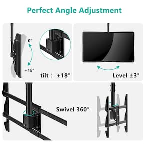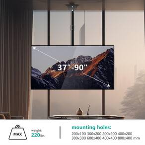 Verifique sua TV e teto: pode ser montado em teto plano, teto abobadado ou 90 graus plano contra a lateral da viga. Verifique o peso da TV e o orifício do parafuso do painel traseiro, o painel traseiro da sua TV deve ter padrão de montagem de 200 mm (8") até 800 mm (32") e peso da TV menor que 100 kg. Verifique e certifique-se de que não há tomada elétrica ou incrustações dentro da área de 4 orifícios de montagem do teto. Especificações do produto: Compatível com TV de até 228.6 cm, 99.8 kg. Padrão do orifício de montagem: 200 x 200, 200 x 300, 400 x 400, 600 x 400, 800 x 400 mm. Inclinação para baixo 18°, rotação 360°. Ajuste de altura incremental de 76 a 91 cm do teto ao centro da placa de montagem. O pacote inclui: 1 x suporte de teto WALI TV (preto) 1 x manual do usuário 1 x kit de ferragens de montagem - Compatibilidade: suporte de TV de teto serve para a maioria dos monitores de até 228.6 cm, 99.8 kg. Padrão do orifício de montagem: 200 x 200, 200 x 300, 400 x 400, 600 x 400, 800 x 400 mm. - Resistente: a estrutura de aço sólido mantém a tela com segurança e facilita a instalação. Este suporte de teto de TV pode ser montado em teto plano. Não monte sozinho na parede de gesso. - AJUSTE: Incline para baixo 18°, alcance giratório esquerda-direita de 360°. Ajuste de altura incremental de 76 a 91 cm do teto ao centro da placa de montagem para os ângulos de visualização perfeitos. - Design ideal: para casa de teto alto, bares, restaurantes, centros de fitness, escola, mercearias, consultórios odontológicos e médicos, instalações domésticas e muito mais. Gerenciamento de cabos incluído. - PACOTE INCLUI: Suporte de teto de TV x 1, kit de ferragens de montagem, manual do usuário, suporte ao cliente experiente e amigável nos EUA disponível para ajudar 7 dias por semana.