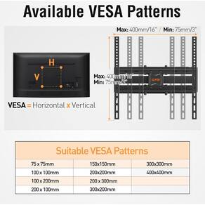 universal de parede para TV - Este suporte de TV é adequado para a maioria das TVs OLED/LED/plasma de 26 a 65 polegadas, com carregamento máximo de 100 libras e tamanhos VESA de 75 x 75 mm (3 x 3”) a 400 x 400 mm (16 x 16”). Este suporte de TV de parede foi projetado para pinos de madeira de 12", 14", 16" ou paredes de concreto/tijolo. Verifique o peso, o tamanho, o tamanho VESA, o espaçamento dos pinos e o acesso à entrada da TV antes de comprar.