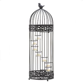 DESCRIÇÃO DO PRODUTO: Um passarinho está sentado no topo desta adorável gaiola que abriga copos de vela à luz de velas com degraus em espiral. A porta da gaiola oferece fácil acesso às velas. Velas não incluídas.