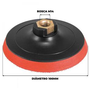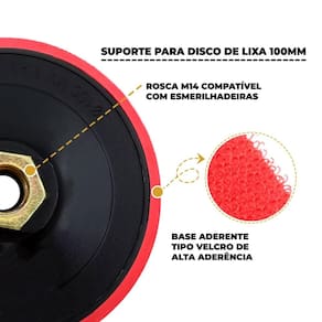 Vantagens: - rosca m14 compatível com maioria das esmerilhadeiras - base com pluma aderente - troca rápida do disco - diâmetro de 100mm 4 - alta resistência para uso contínuo e profissional - melhora o rendimento e evita danos no lixamento - suporte firme, sem vibração ou soltura