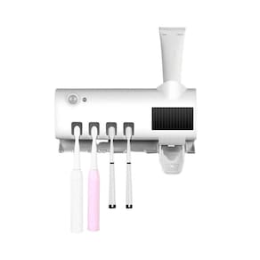 Suporte Dispenser Automático de Pasta de Dente com Esterilizador UV Suporte Dispenser Automático para Escovas e Pasta de Dente com Esterilizador UV O porta escova de dentes solar possui uma tecnologia avançada, contendo o raio ultravioleta e foto catalisador que agiliza a esterilização eletrônica, matando 99,9% das bactérias e micro-organismos que causam danos nas escovas de dente e na saúde bucal. A bomba de vácuo libera o creme dental em uma quantidade adequada, evitando desperdício. O dispenser tem um sistema de carregamento solar e iluminação doméstica, não sendo necessário plugues e baterias para substituir, que garante segurança e economia. ESPECIFICAÇÕES TÉCNICAS: Medidas: largura 19,2 cm x comprimento 5 cm x Altura 13,5 cm Cores disponíveis: Preto e Branco Material: ABS Entrada: Bivolt 100-240 v 50/60 hz 1 Dica: Use USB para carregar por 6 horas antes do primeiro uso; 2 Dica: Faça uma marcação na sua parede antes de instalar o produto para uma melhor visualização do local; 3 Dica: Para instalar basta remover a fita dupla-face, pressionar 3 vezes, e colocar o selante em torno dele; 4 Dica: Sem necessidade de ativação manual, o sensor inteligente ativo quando uma pessoa se aproxima e começa a esterilizar depois de sair.