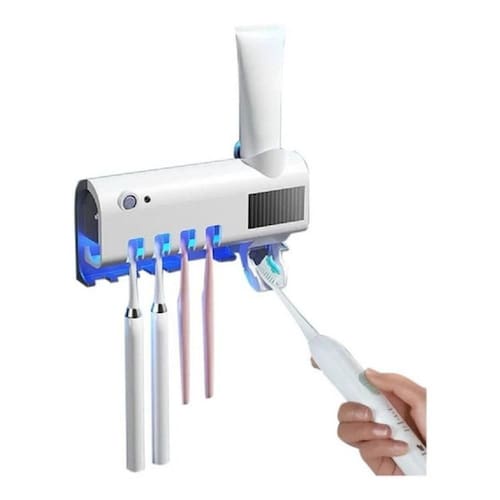 Suporte Dispenser De Pasta De Dente Com Esterilizador Uv O porta escova de dentes solar possui uma tecnologia avançada, contendo o raio ultravioleta e fotocatalisador que agiliza a esterilização eletrônica, matando 99,9% das bactérias e micro-organismos que causam danos nas escovas de dente e na saúde bucal. A bomba de vácuo libera o creme dental em uma quantidade adequada, evitando desperdício. O dispenser tem um sistema de carregamento solar e iluminação doméstica, não sendo necessário plugues e baterias para substituir, que garante segurança e economia.