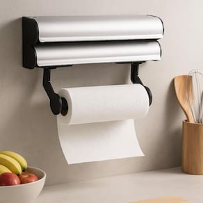 Esse acessório inteligente permite armazenar rolos de papel alumínio, filme plástico e papel toalha, proporcionando cortes precisos com suas lâminas integradas e acesso facilitado no dia a dia. Ideal para quem valoriza eficiência e elegância na rotina.