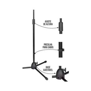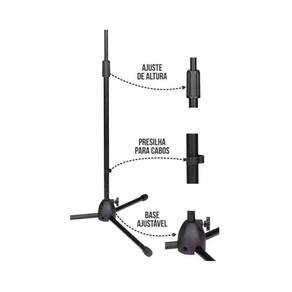 Suporte modelo girafa ideal para até 2 microfones, produto fabricado em metal com acabamento na pintura eletrostática (tratamento anti-ferrugem) na cor preto e partes em ABS (Plástico de excelente qualidade e durabilidade)