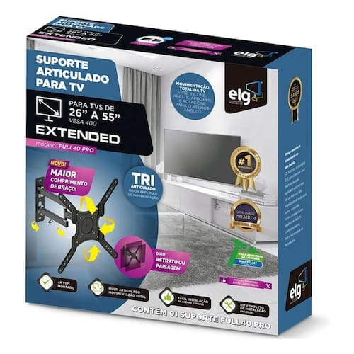 Suporte ELG Multi Articulado Giratório TV/Monitor Full40pro Suporte elg Full 40 Pro, articulado e giratório de parede compatível com TVs de 26 a 55 que apresentem peso máximo de 30kg e padrão de furação VESA 75x75 a 400x400mm (HxV). Possui afastamento mínimo da parede de 6,5cm e afastamento máximo de 41cm e inclinação vertical de -15 a +3 e ajuste lateral de +90 a -90 (retrato/paisagem). Praticidade no dia-a-dia e integração entre ambientes. O suporte já vem montado de fábrica e possui instalação simples e intuitiva em apenas 3 passos. ELG Soluções Inteligentes