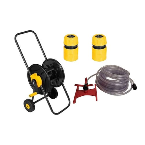 1 Suporte para mangueira com rodas, acompanha: 2 conectores 1/2" (fêmea), 1 conector principal (macho). Possui corpo em plástico ABS, manivela para acionamento, base e alça metálicas tubulares para transporte/apoio. Acompanha conectores macho para engate rápido 1/2". Fácil montagem, não necessita de ferramentas. Indicado para enrolamento de até 45 m de mangueira de jardim 1/2" (não acompanha mangueira).