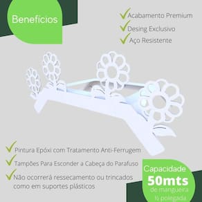 Suporte Enrolador De Mangueira De Jardim Flor Branco Mangueira de Jardim é um item que não pode faltar em nossa casa, porém, se você não armazenar de forma adequada, surgem alguns problemas como ficar torcida, dificuldades para desenrolar ou ocupar grande espaço de forma desordenada.