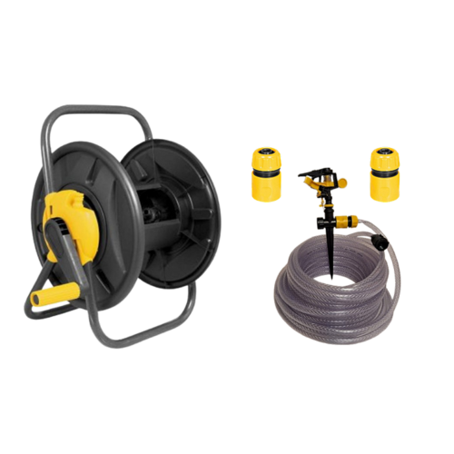 Kit composto de 1 enrolador de mangueira sem rodas Vonder + 1 Mangueira para jardim, trançada, transparente, 20 m, Vonder + 3 Engates rápidos 1/2¨ passagem livre Vonder + Irrigador setorial tipo espiga VONDER gramado horta jardim