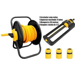 Kit composto de 1 enrolador de mangueira sem rodas Vonder + 30m Mangueira para jardim, superflexível, 1/2 + 3 Engates rápido 1/2 passagem livre Vonder + 1 Aspersor oscilante 17 jatos Vonder - Enrolador de mangueira sem rodas Vonder Conteúdo da Embalagem: 1 Suporte para mangueira, acompanha: 2 conectores 1/2 fêmea , 1 conector principal macho . Possui corpo em plástico ABS, com manivela para acionamento, base e alça metálicas tubulares para transporte/apoio. Acompanha conectores macho para engate rápido 1/2. Fácil montagem, não necessita de ferramentas. Indicado para enrolamento de até 30 m de mangueira de jardim 1/2 não acompanha mangueira . legal: 90 dias DETALHES TÉCNICOS Capacidade do suporte enrolador para mangueira:Até 30 m Cor do suporte enrolador para mangueira:Amarelo e preto Material do suporte enrolador para mangueira:Plástico ABS Massa aproximada peso :1,67 kg - Mangueira para jardim, superflexível, 1/2 Vonder Conteúdo da Embalagem: 1 Rolo de mangueira 30 m. Possui PVC resistente aos raios ultravioleta. Indicada para condução de água fria em limpeza e irrigação em jardim. NÃO é trançada. legal: 90 dias + contratual: 3 meses - Aspersor oscilante 17 jatos Vonder Conteúdo da Embalagem: 1 Aspersor. Possui 17 jatos de água e sistema oscilante ajustável em até 180, proporcionando ampla eficiência e alcance na irrigação.Indicado para irrigações em geral. Vazão aproximada: 1.200 litros/h. legal: 90 dias DETALHES TÉCNICOS Cor: Amarelo e preto Material: Plástico Diâmetro da mangueira: Engate rápido de 1/2 Massa aproximada peso : 0,262 kg Ean: 7908481206542