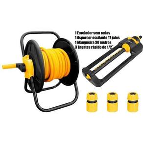 Kit composto de 1 enrolador de mangueira sem rodas Vonder + 30m Mangueira para jardim, superflexível, 1/2 + 3 Engates rápido 1/2 passagem livre Vonder + 1 Aspersor oscilante 17 jatos Vonder - Enrolador de mangueira sem rodas Vonder Conteúdo da Embalagem: 1 Suporte para mangueira, acompanha: 2 conectores 1/2 fêmea , 1 conector principal macho . Possui corpo em plástico ABS, com manivela para acionamento, base e alça metálicas tubulares para transporte/apoio. Acompanha conectores macho para engate rápido 1/2. Fácil montagem, não necessita de ferramentas. Indicado para enrolamento de até 30 m de mangueira de jardim 1/2 não acompanha mangueira . legal: 90 dias DETALHES TÉCNICOS Capacidade do suporte enrolador para mangueira:Até 30 m Cor do suporte enrolador para mangueira:Amarelo e preto Material do suporte enrolador para mangueira:Plástico ABS Massa aproximada peso :1,67 kg - Mangueira para jardim, superflexível, 1/2 Vonder Conteúdo da Embalagem: 1 Rolo de mangueira 30 m. Possui PVC resistente aos raios ultravioleta. Indicada para condução de água fria em limpeza e irrigação em jardim. NÃO é trançada. legal: 90 dias + contratual: 3 meses - Aspersor oscilante 17 jatos Vonder Conteúdo da Embalagem: 1 Aspersor. Possui 17 jatos de água e sistema oscilante ajustável em até 180, proporcionando ampla eficiência e alcance na irrigação.Indicado para irrigações em geral. Vazão aproximada: 1.200 litros/h. legal: 90 dias DETALHES TÉCNICOS Cor: Amarelo e preto Material: Plástico Diâmetro da mangueira: Engate rápido de 1/2 Massa aproximada peso : 0,262 kg Marca: Não Informado
