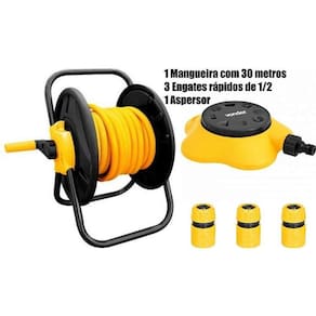 Kit composto de 1 enrolador de mangueira sem rodas Vonder + 30 m Mangueira para jardim, superflexível, 1/2 + 3 Engates rápido 1/2 passagem livre Vonder + 1 Irrigador plástico múltiplo IM 601 VONDER - Enrolador de mangueira sem rodas Vonder Conteúdo da Embalagem: 1 Suporte para mangueira, acompanha: 2 conectores 1/2 fêmea , 1 conector principal macho . Possui corpo em plástico ABS, com manivela para acionamento, base e alça metálicas tubulares para transporte/apoio. Acompanha conectores macho para engate rápido 1/2. Fácil montagem, não necessita de ferramentas. Indicado para enrolamento de até 30 m de mangueira de jardim 1/2 não acompanha mangueira . Garantia legal: 90 dias DETALHES TÉCNICOS Capacidade do suporte enrolador para mangueira:Até 30 m Cor do suporte enrolador para mangueira:Amarelo e preto Material do suporte enrolador para mangueira:Plástico ABS Massa aproximada peso :1,67 kg - Mangueira para jardim, superflexível, 1/2 Vonder Conteúdo da Embalagem: 1 Rolo de mangueira 30 m. Possui PVC resistente aos raios ultravioleta. Indicada para condução de água fria em limpeza e irrigação em jardim. NÃO é trançada. Garantia legal: 90 dias + Garantia contratual: 3 meses - irrigador plástico múltiplo IM 601 VONDER Conteúdo da Embalagem: 1 Irrigador e 1 conector para engate rápido. Fabricado em plástico ABS de alta resistência. Possui jatos múltiplos, 8 posições de ajustes jato setorial, jato triangular, jato retangular, jato semi flat, jato semi círculo, jato quadrado, jato círculo e jato ducha spray . DETALHES TÉCNICOS Tipo de irrigador para jardim: Múltiplo Material: Plástico ABS Engate: 3/4 Diâmetro de alcance na pressão máxima: 4,6 metros. Quando utilizado no jato triangular o alcance é maior: 14,4 metros a 16,6 metros Pressão máxima de trabalho: 4 bar - 58 lbf/pol Massa aproximada peso : 0,227 kg Indicado para irrigações em geral. Garantia legal: 90 dias