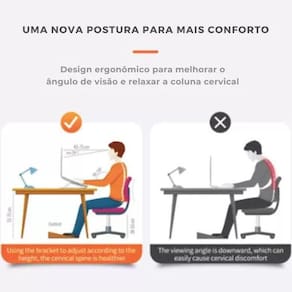 Por isso nosso suporte faz a correção da sua linha de visão à tela do notebook, ajustando sua coluna para a posição correta, proporcionando maior comodidade e conforto, evitando fadigas nas regiões lombar, nuca e pescoço.