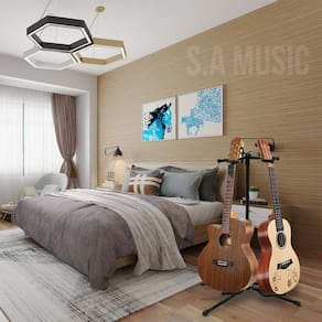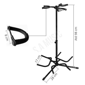 Características: Suporte conjugado para Violão, Guitarra, Contra Baixo, Cavaco, entre outros instrumentos de Cordas; Cada suporte possui uma leve elevação superior ( atuando como Trava ), deste modo evitando que o instrumento deslize do suporte; A base superior ( apoio do Headstock ) e inferior ( apoio de trás dos instrumentos ) são articuláveis, facilitando montar / desmontar; Base revestida com material acolchoado e aveludado ( tipo E.V.A ) ( Headstock dos instrumentos ); Apoio ( partes de trás dos instrumentos ) revestido com material acolchoado e aveludado ( tipo E.V.A ); Tubos em metalon com pintura eletrostática na cor Preto; Tripé emborrachado, proporcionando maior aderência e/ou evitar riscar ou danificar o piso; Excelente estabilidade e durabilidade; Disponível na cor Preto.