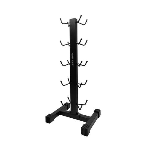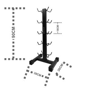 Características: Altura total do suporte: 90cm Comprimento do pé: 30cm Largura do pé: 39cm Distância entre suportes: 18cm Pintura eletrostática na cor preta. Capacidade para 10 halteres. Marca: Iron Health Equipamentos Ean: 7898701180182