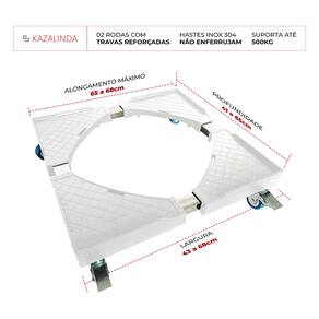- Movimentação sem esforço: Projetado para facilitar a locomoção de objetos pesados, tornando a limpeza e organização do ambiente mais fácil. - Tamanho ajustável: Adapta-se perfeitamente a diversos eletrodomésticos com sua largura ajustável de 43 a 68 cm e profundidade de 41 a 65 cm. O alongamento máximo é de 65 x 68 cm. - Alta capacidade: Suporta até 500 kg, garantindo segurança e estabilidade. - Segurança reforçada: Acompanha duas rodinhas com trava, proporcionando maior segurança e estabilidade durante o uso e no posicionamento do aparelho. - Design Discreto: Com altura de 11 cm e cor branca, integra-se harmoniosamente ao ambiente sem comprometer a estética.