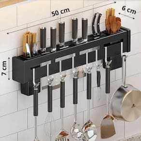 Este suporte é adequado para organizar quais tipos de utensílios?O suporte é ideal para organizar colheres, espátulas, panelas, utensílios de churrasco e muitos outros utensílios de cozinha.Qual é o material do suporte?O suporte é feito de aço inoxidável robusto, garantindo durabilidade e resistência à corrosão.O suporte é fácil de instalar?Sim, o suporte acompanha buchas, parafusos e travas para uma fixação segura e prática.Quais são as dimensões do suporte?O suporte tem 50cm de comprimento, 7cm de altura e 6cm de profundidade.Quantos ganchos o suporte possui?O suporte possui 8 ganchos resistentes para organizar diversos utensílios de cozinha.O suporte é resistente à corrosão?Sim, a construção em aço inoxidável de alta qualidade garante resistência à corrosão e durabilidade ao longo do tempo.