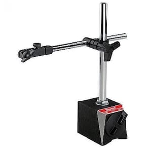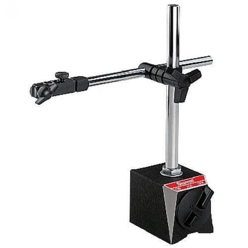 Características: - Chave liga-desliga; - Parte inferior da base em V para fixação em superfícies cilíndricas; - Prende relógios com canhão de 3/8" e 8mm, e relógios apalpadores com fixação por rabo-de-andorinha; - Parafuso de ajuste fino ultra-sensível na haste horizontal.