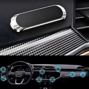 Fixação magnética com ímãs de alta potência, estrutura em liga de alumínio, ajuste de ângulo 360 graus, instalação adesiva em superfícies planas.